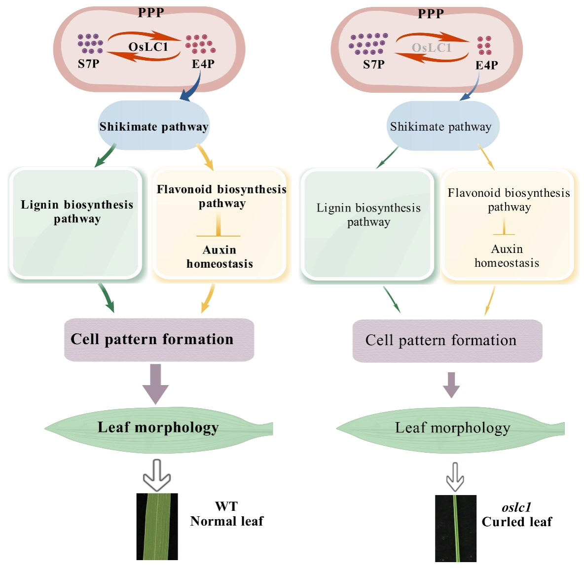 该研究团队利用图位克隆技术,在水稻卷叶突变体中鉴定出一个调控叶片发育的关键基因OsLC1。通过功能解析发现,OsLC1编码磷酸戊糖途径非氧化阶段的关键酶——转醛醇酶(Transaldolase,TA),其突变导致叶片维管系统、叶肉细胞、保卫细胞、泡状细胞和厚壁细胞的排列和发育异常。进一步研究阐明,细胞发育模式的改变与类黄酮介导的生长素稳态扰动及木质素代谢失衡密切相关。该研究首次将转醛醇酶的功能与植物叶片发育联系起来,揭示了次级代谢产物通过激素信号调控细胞模式的分子途径。这不仅为解析叶片形态建成的复杂网络提供了新视角,还为作物抗逆育种提供了潜在靶点。例如,通过调控OsLC1表达或代谢通路,可能同步改善水稻叶片结构(增强抗旱性)和产量性状,助力可持续农业发展。